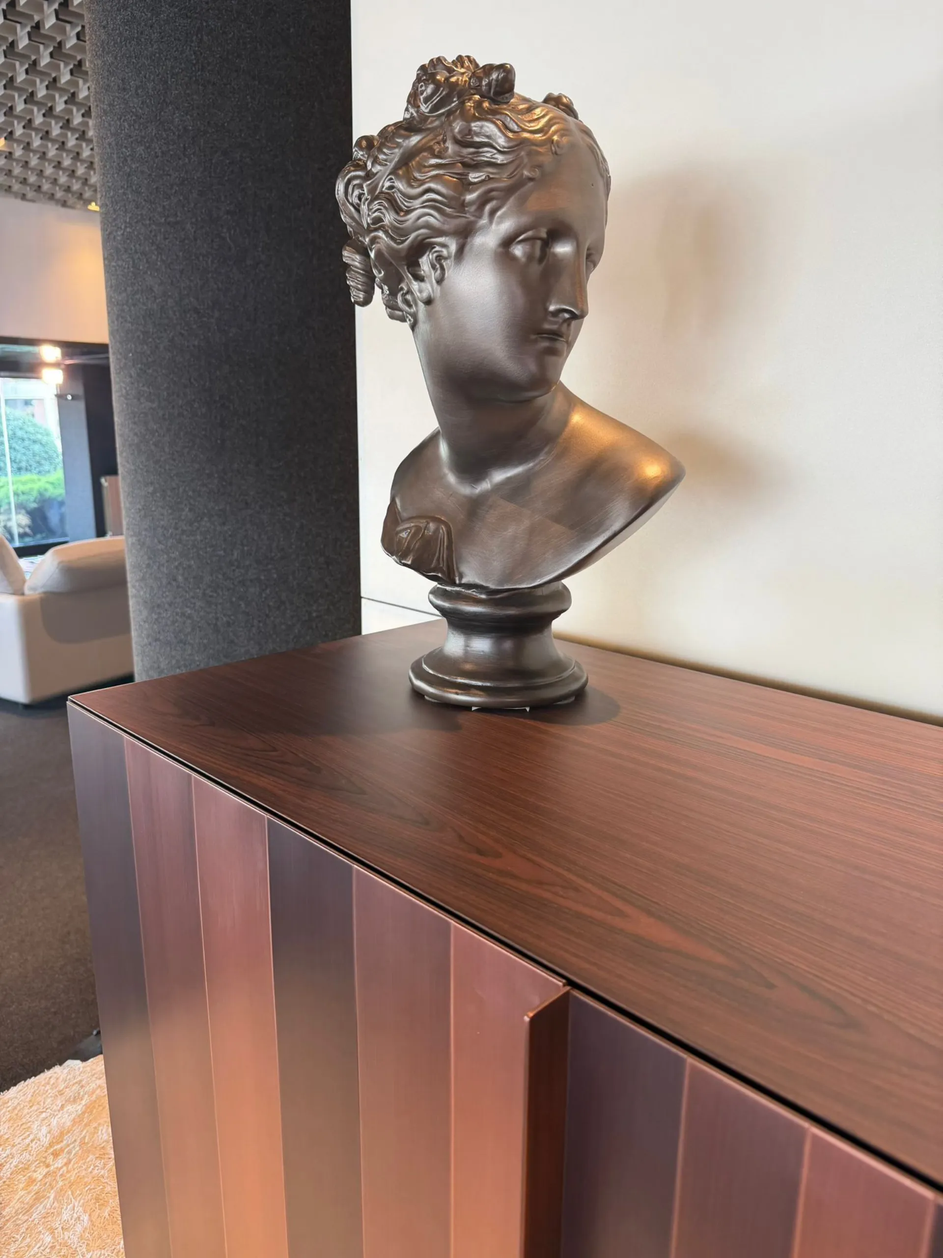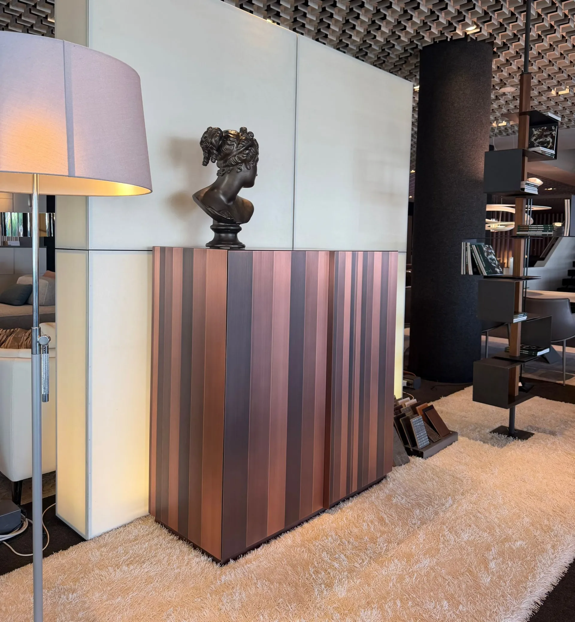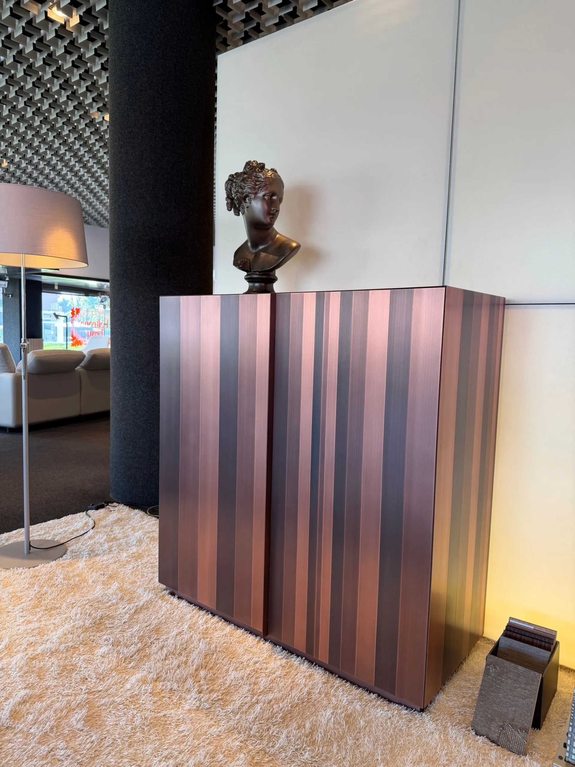 La credenza STARS ST 01 di Laurameroni rappresenta un connubio perfetto tra design sofisticato e funzionalità. Questo pezzo unico si distingue per la sua struttura rivestita in una sequenza di strisce di rame brunito, che conferiscono un aspetto elegante e contemporaneo. Le ante battenti nascondono al loro interno tre cassetti spaziosi e un ripiano in palissandro, lo stesso materiale pregiato utilizzato per il top, offrendo ampio spazio per organizzare con stile.
