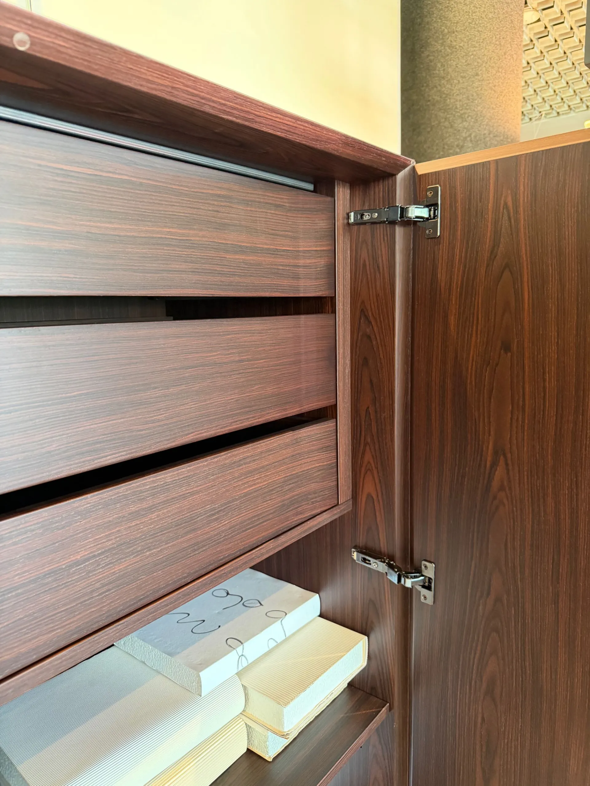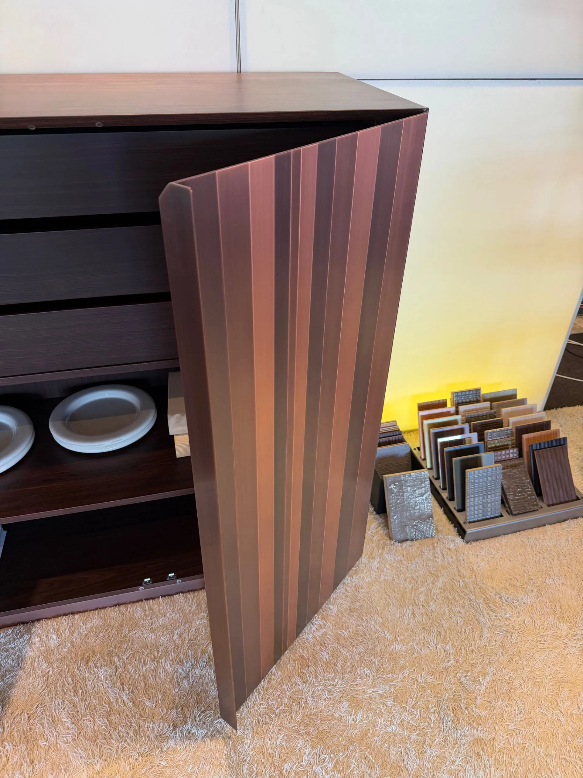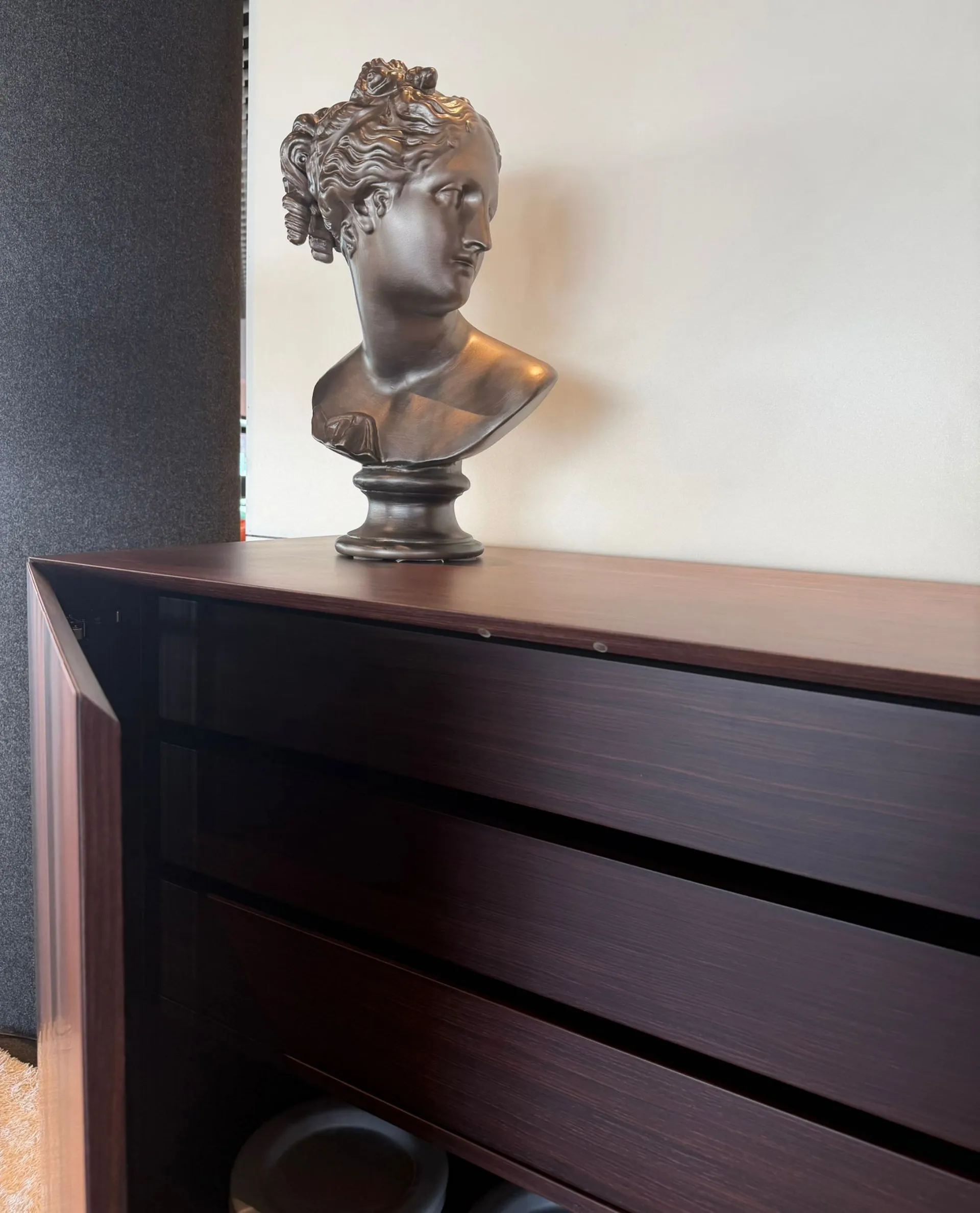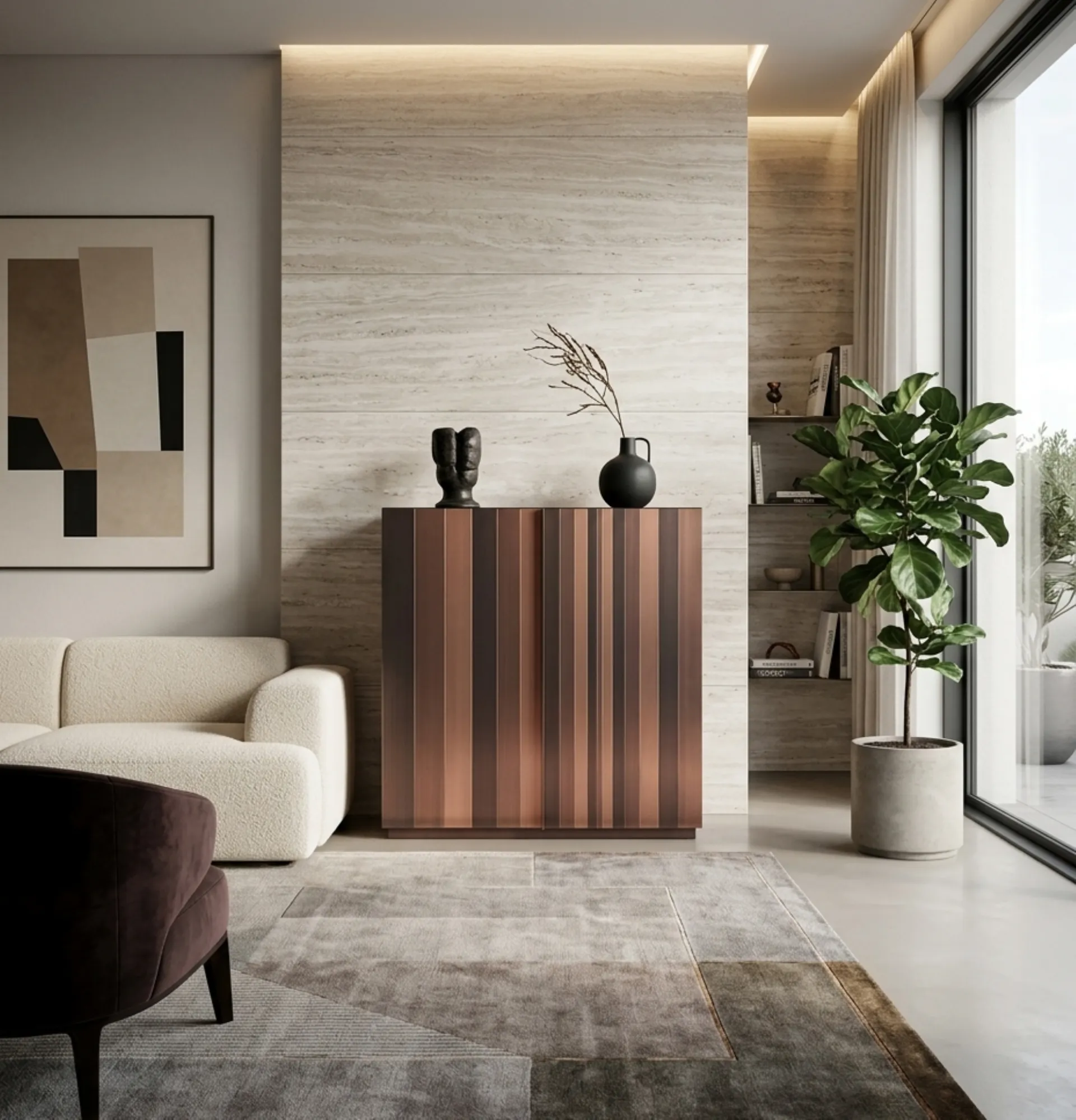 La credenza STARS ST 01 di Laurameroni rappresenta un connubio perfetto tra design sofisticato e funzionalità. Questo pezzo unico si distingue per la sua struttura rivestita in una sequenza di strisce di rame brunito, che conferiscono un aspetto elegante e contemporaneo. Le ante battenti nascondono al loro interno tre cassetti spaziosi e un ripiano in palissandro, lo stesso materiale pregiato utilizzato per il top, offrendo ampio spazio per organizzare con stile.