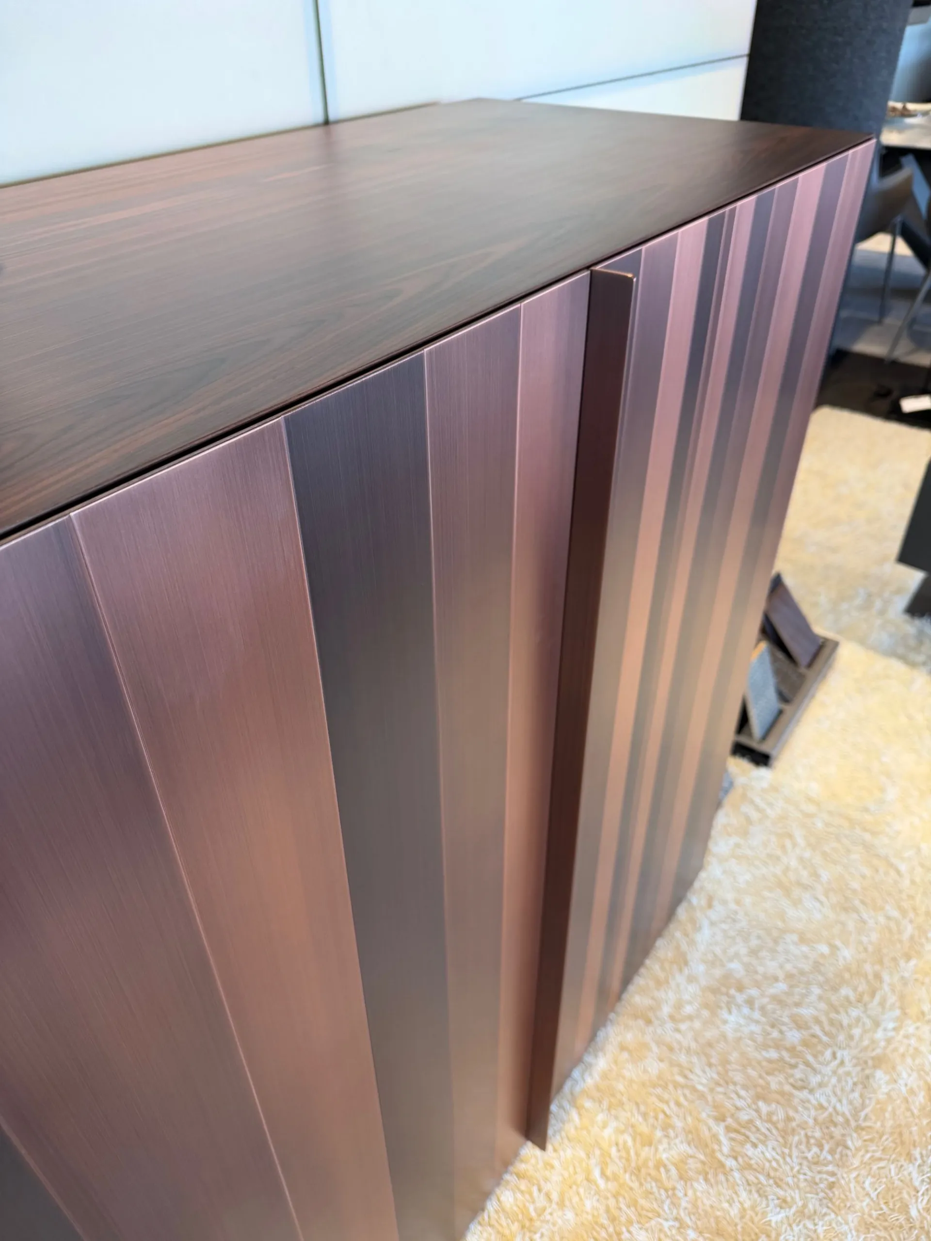 I fianchi delle ante e lo zoccolo sono anch'essi rivestiti in rame brunito, creando un gioco visivo affascinante che cattura l'attenzione. Questa credenza non è solo un elemento d'arredo, ma una vera e propria opera d'arte che arricchisce qualsiasi ambiente con la sua importante presenza.