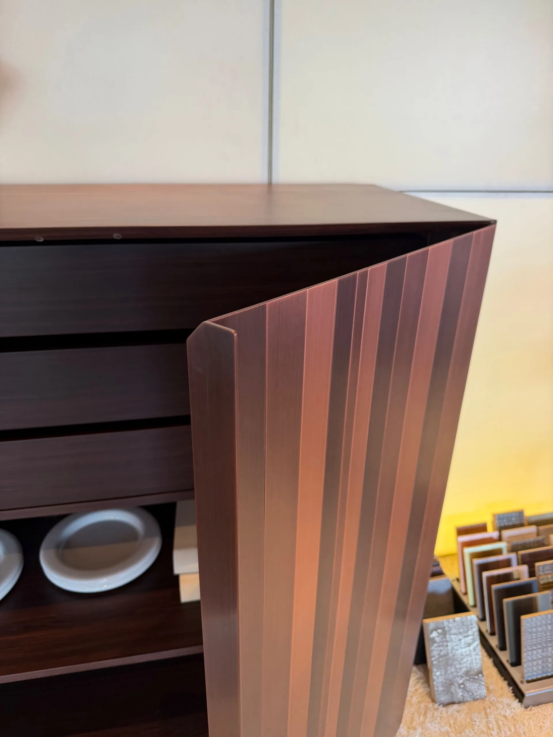 Le creazioni Laurameroni sono rinomate per essere prodotti su misura di alta gamma, ognuno diverso dall'altro, rendendo ogni pezzo irripetibile. La finitura in rame brunito combinata con il palissandro esalta la qualità artigianale e l'attenzione ai dettagli tipica del marchio.
