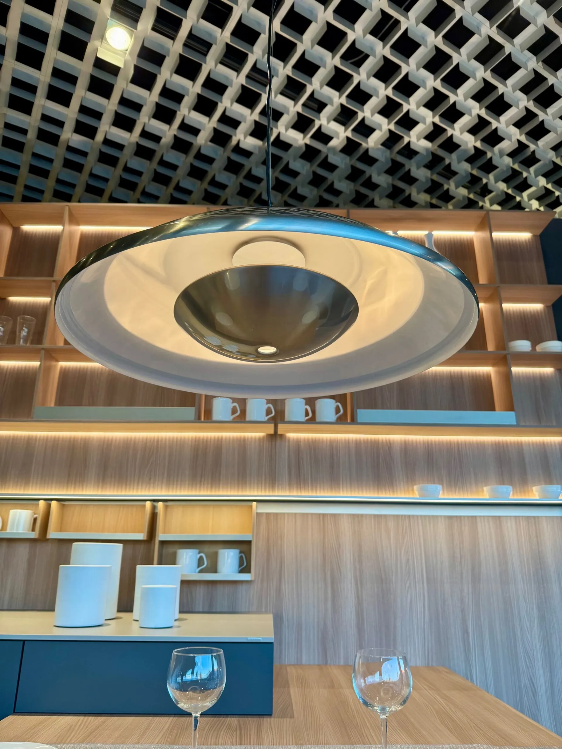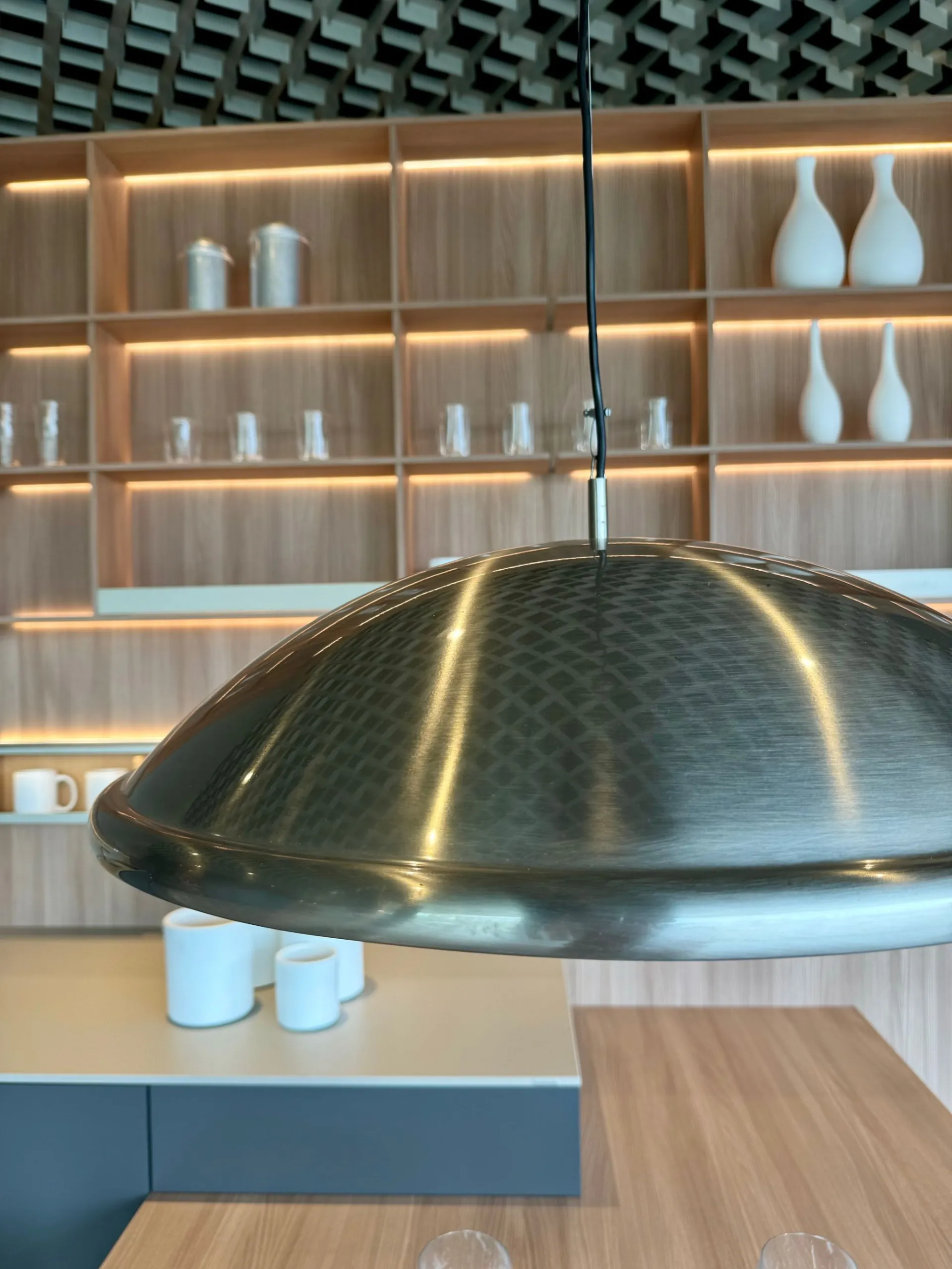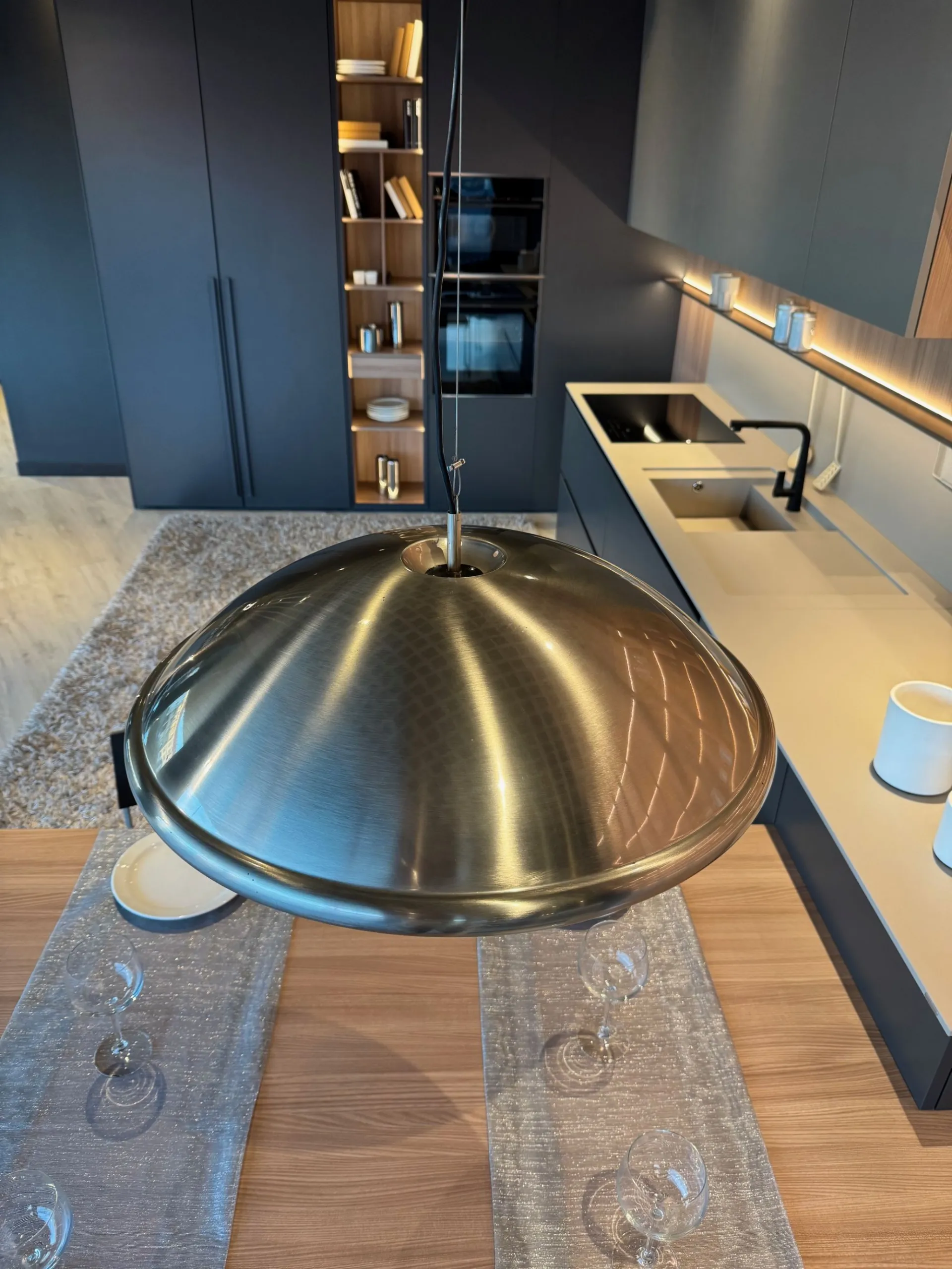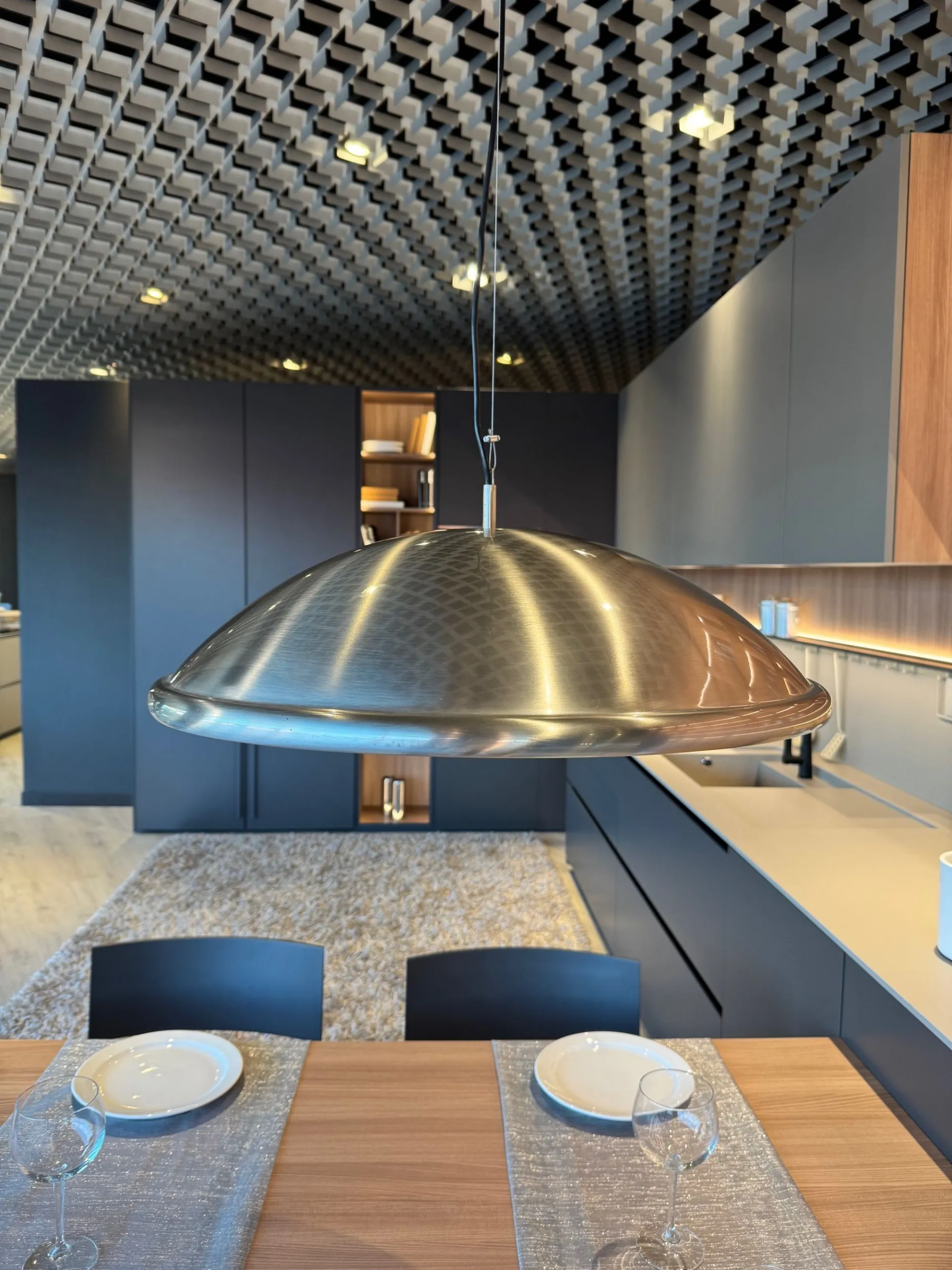 Questa lampada non è solo un elemento funzionale ma anche un vero e proprio pezzo d'arte che cattura l'attenzione. La sua presenza sopra il tavolo da pranzo o l'isola della cucina diventa subito protagonista dello spazio, valorizzando l'ambiente con la sua luce calda e invitante.