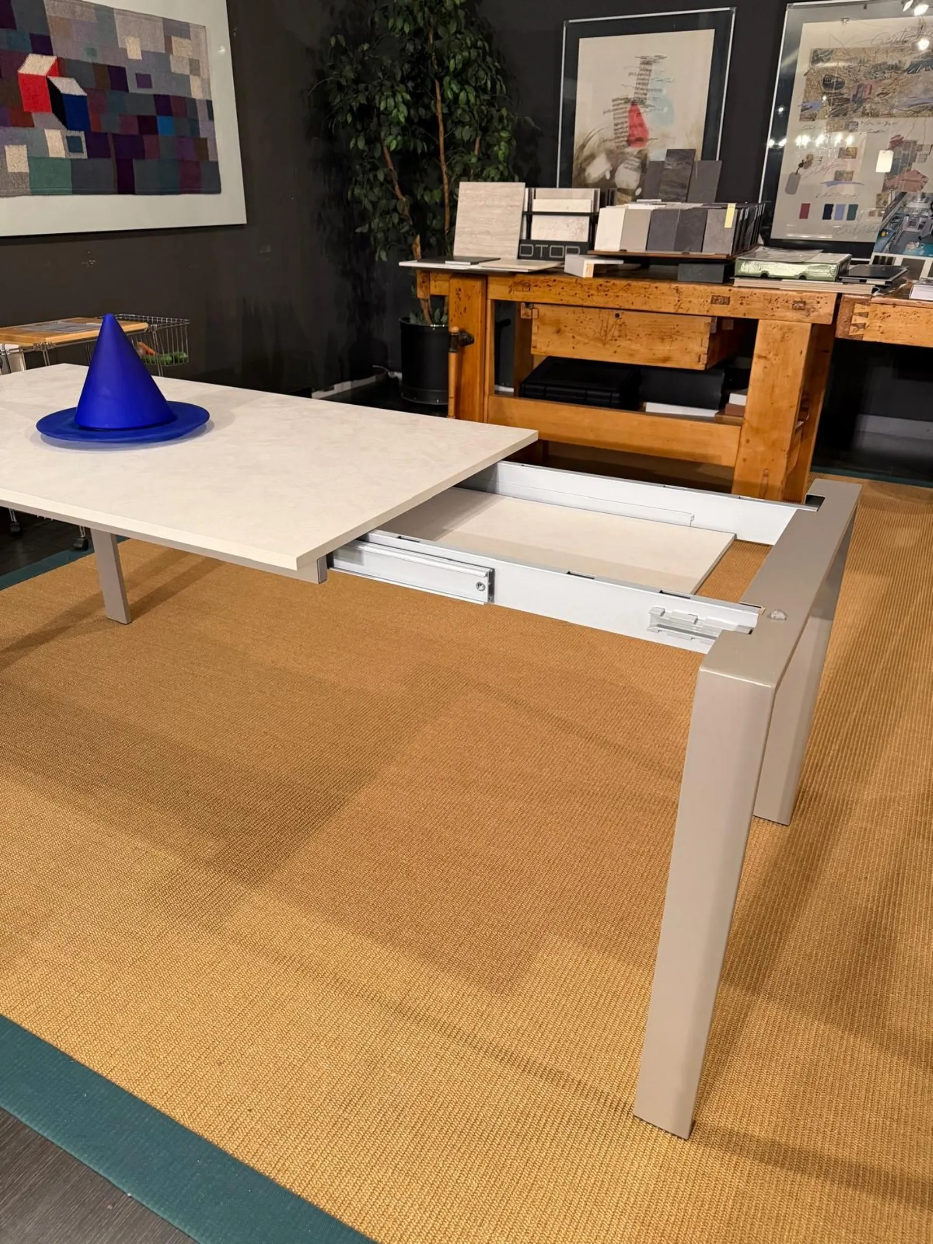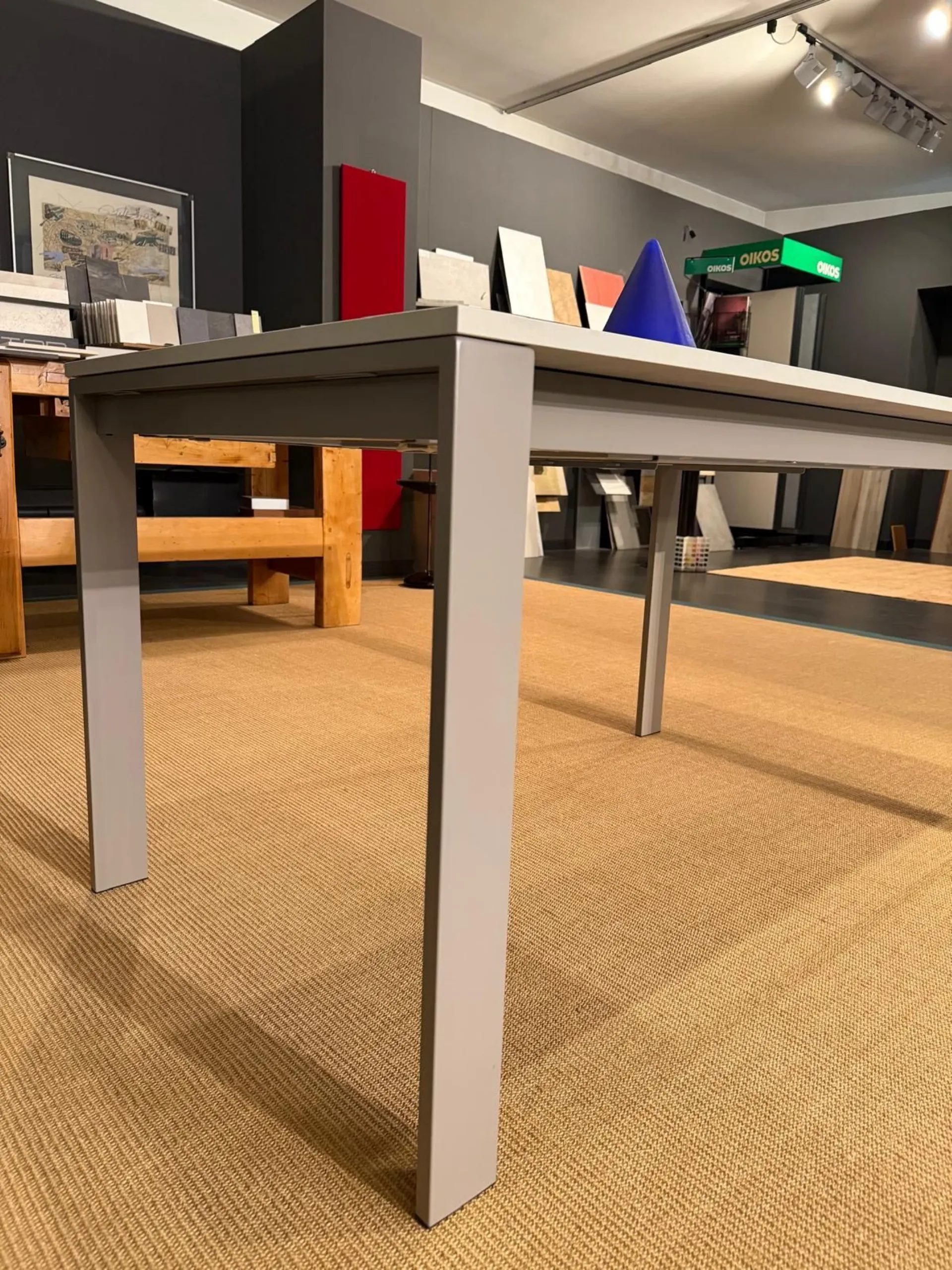 La struttura del tavolo è realizzata in metallo verniciato tortora opaco, un colore neutro che si integra armoniosamente con il piano ghiaccio, creando un effetto visivo raffinato. Le gambe robuste assicurano stabilità e supporto, rendendo il tavolo non solo esteticamente gradevole ma anche estremamente pratico.