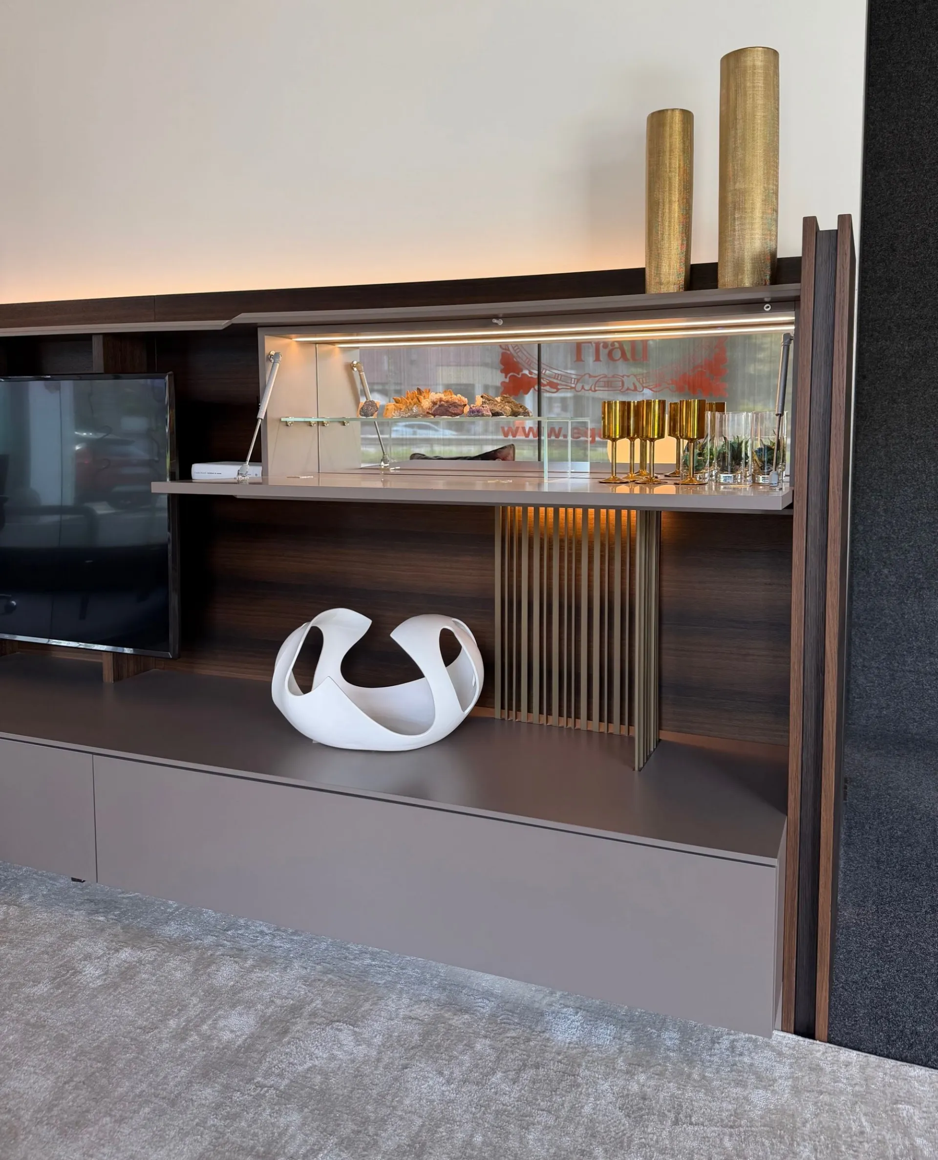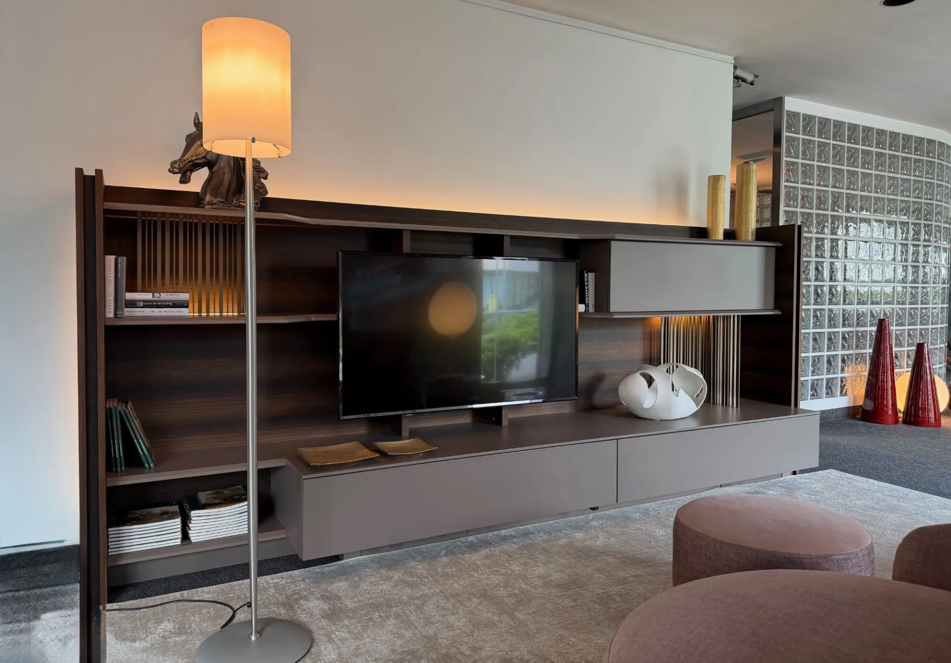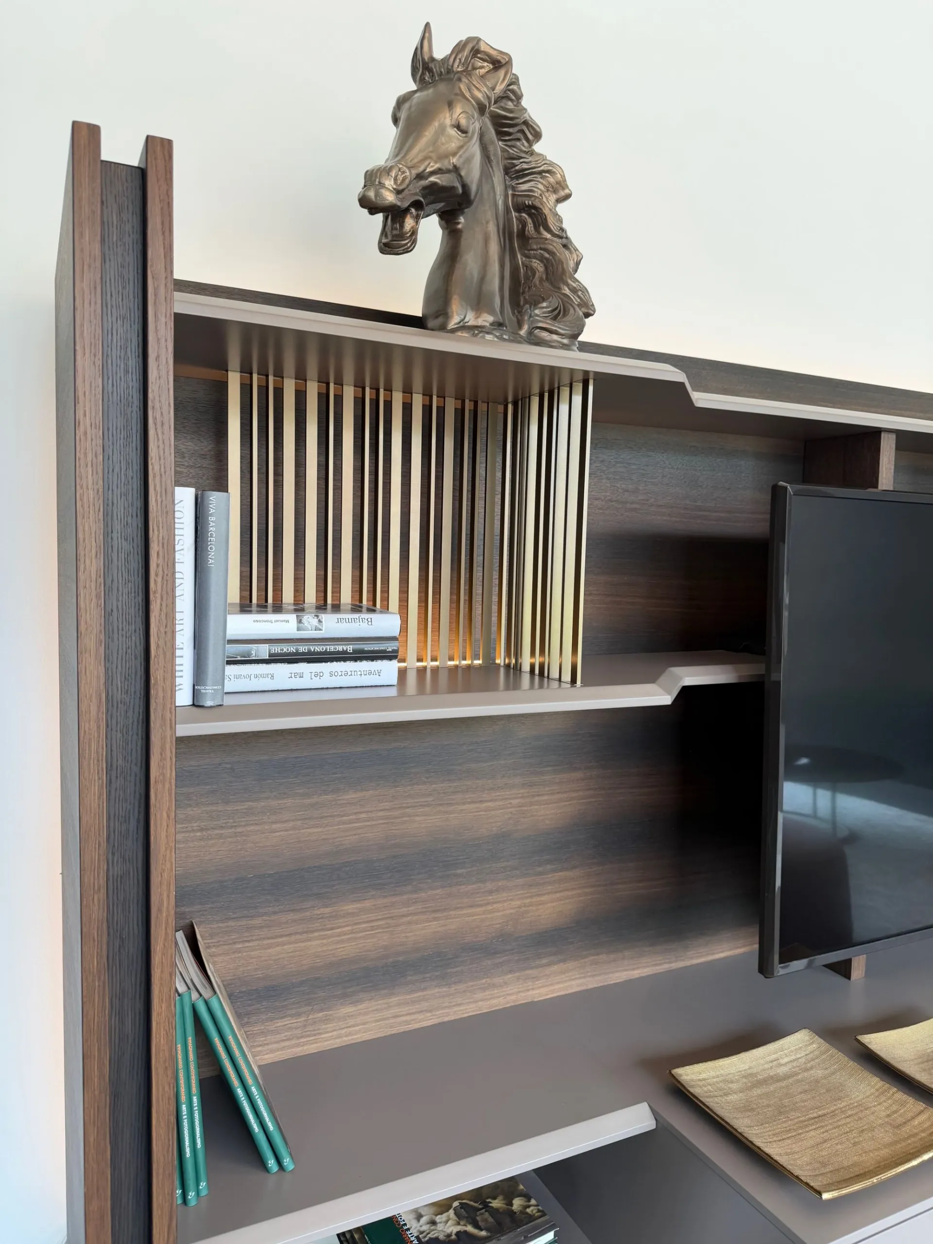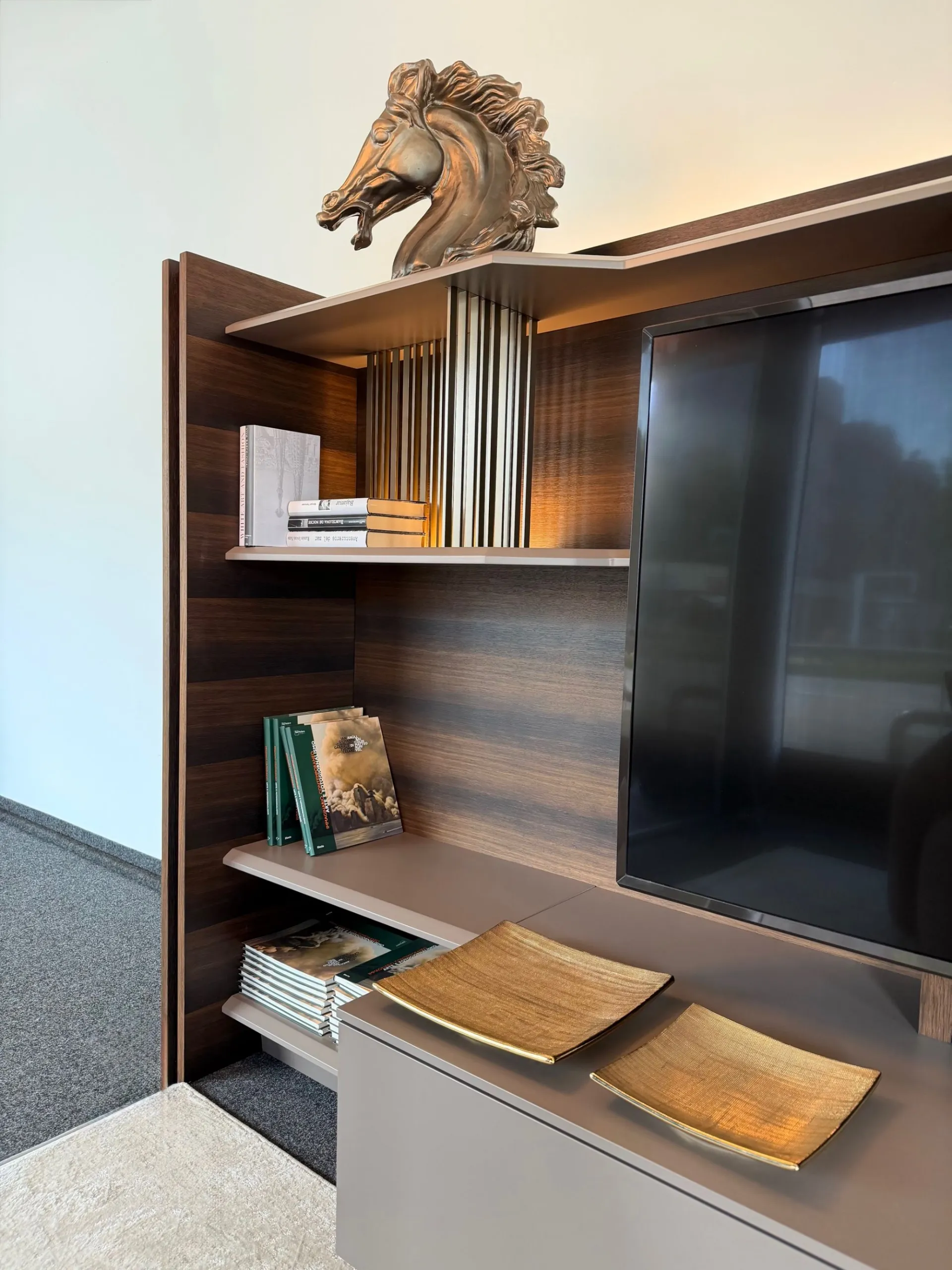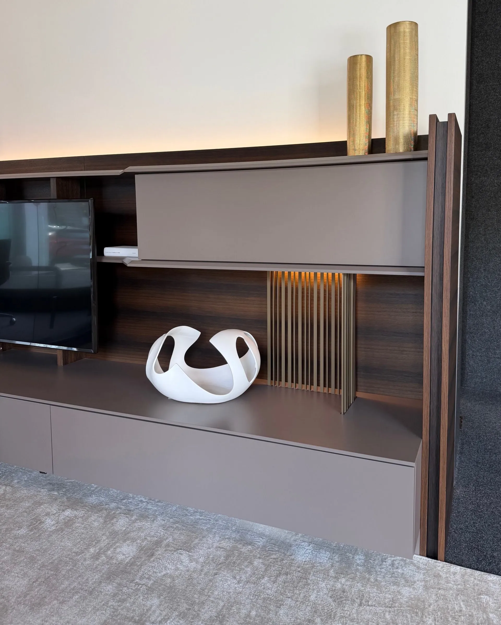 - ripiani smussati sullo spessore e sagomati accompagnano perfettamente il posizionamento della TV, creando una composizione armoniosa e sofisticata;
