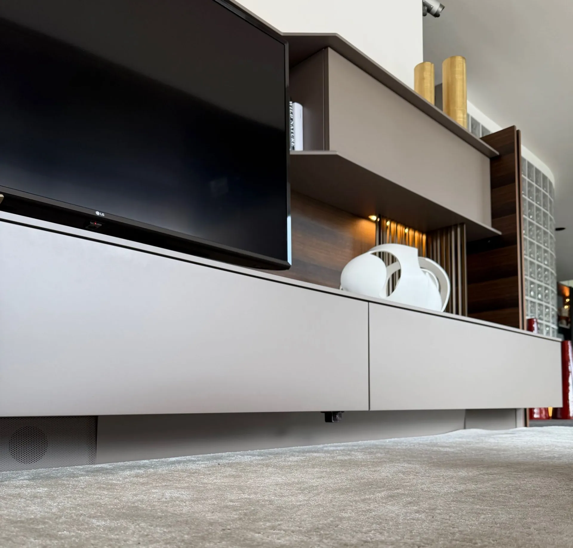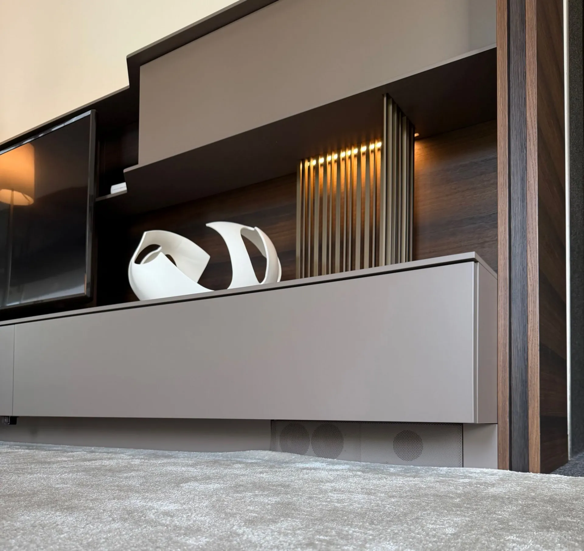 - l'effetto sospeso dello zoccolo dona leggerezza visiva, questo elemento è ideato per alloggiarvi il sistema audio;