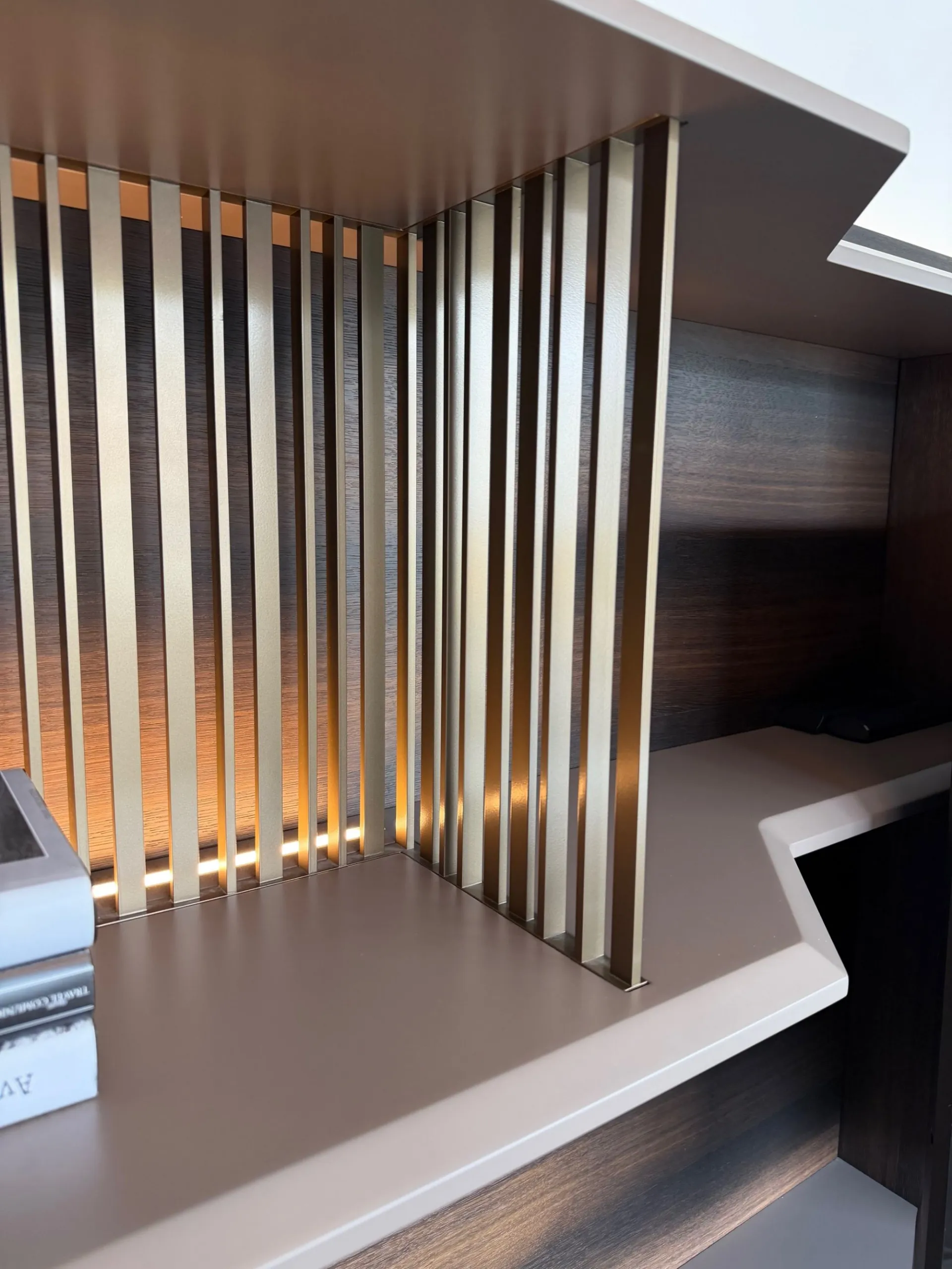 - a rendere tutto ancora più suggestivo ci pensano le due strutture metalliche a listelli verticali in finitura ottone, retroilluminate da LED incassati nei ripiani, un dettaglio luminoso che valorizza l'intero ambiente e crea un'atmosfera accogliente e di design;