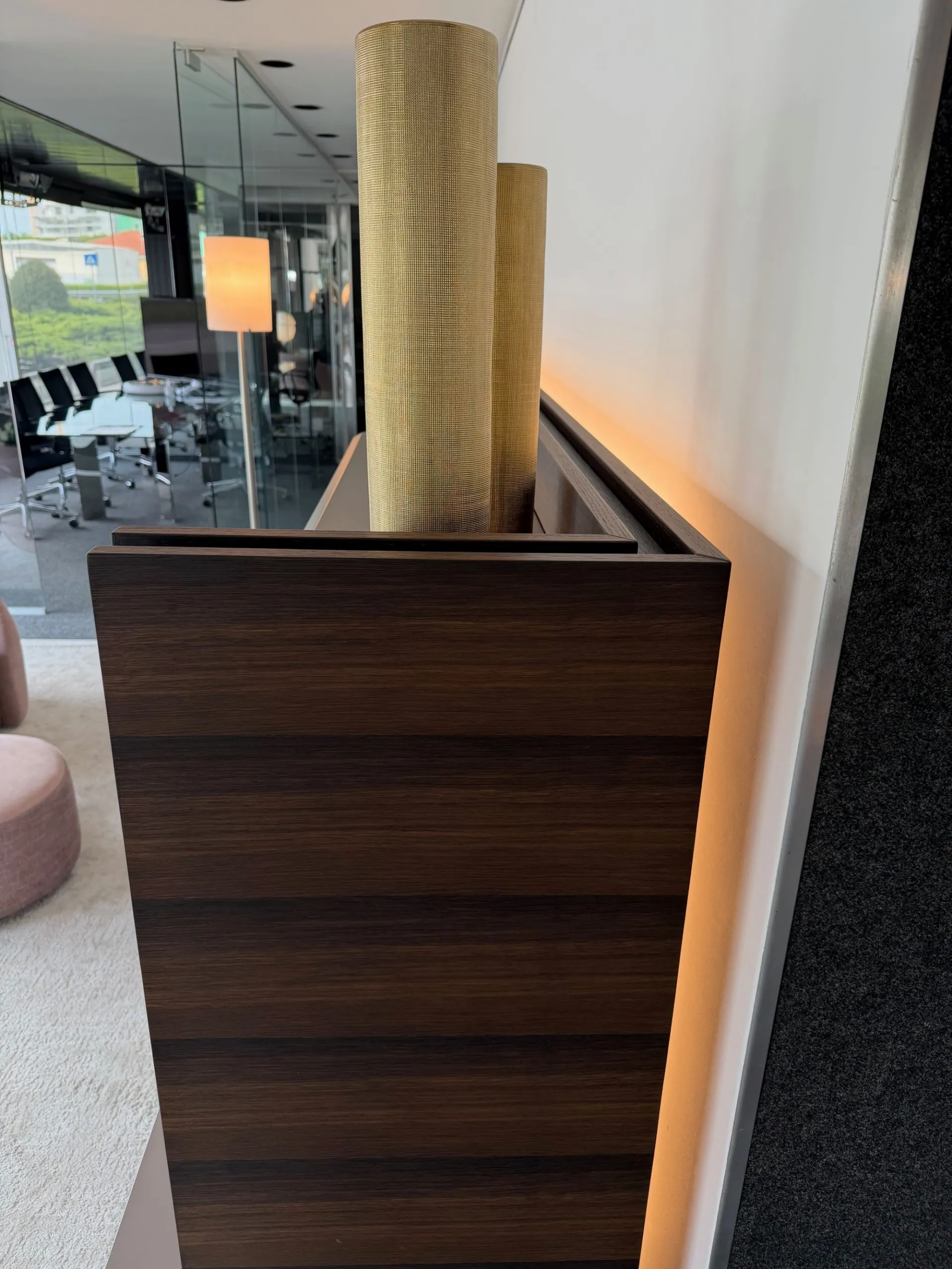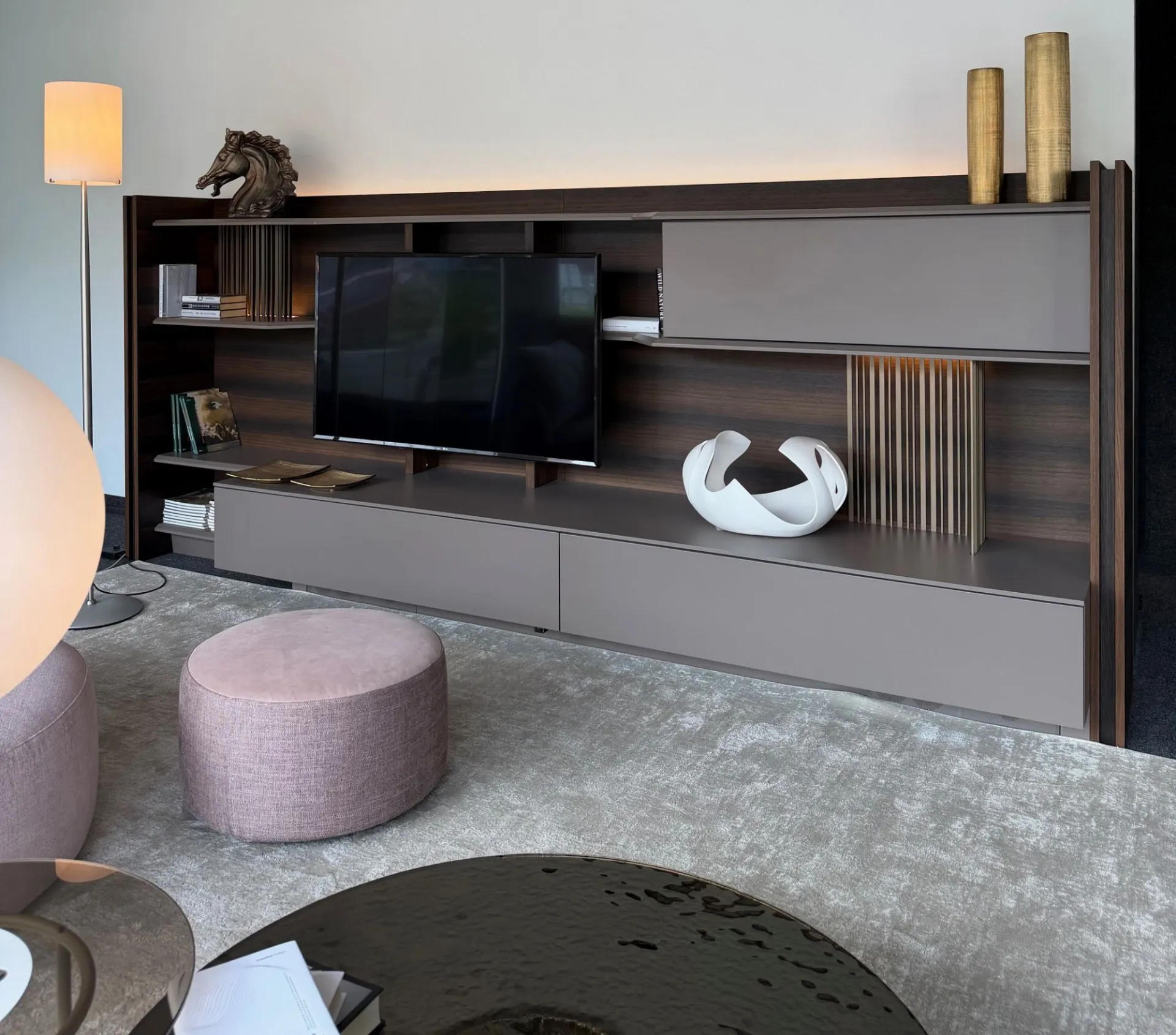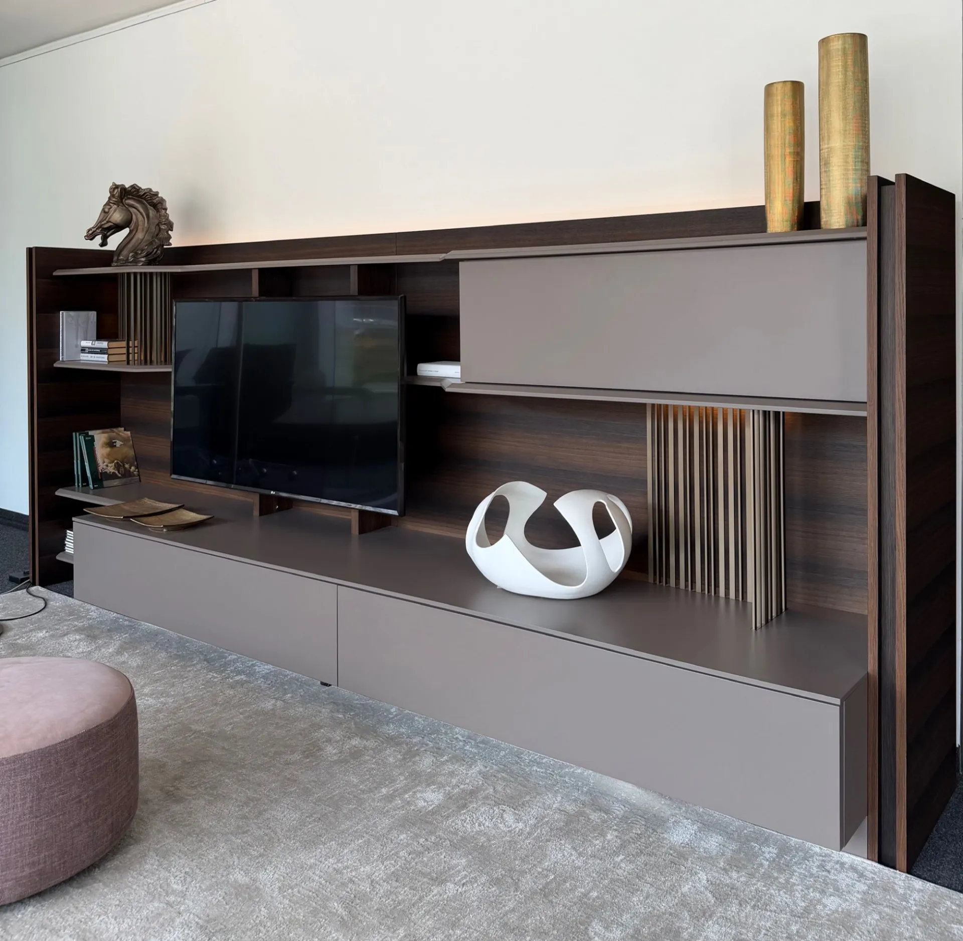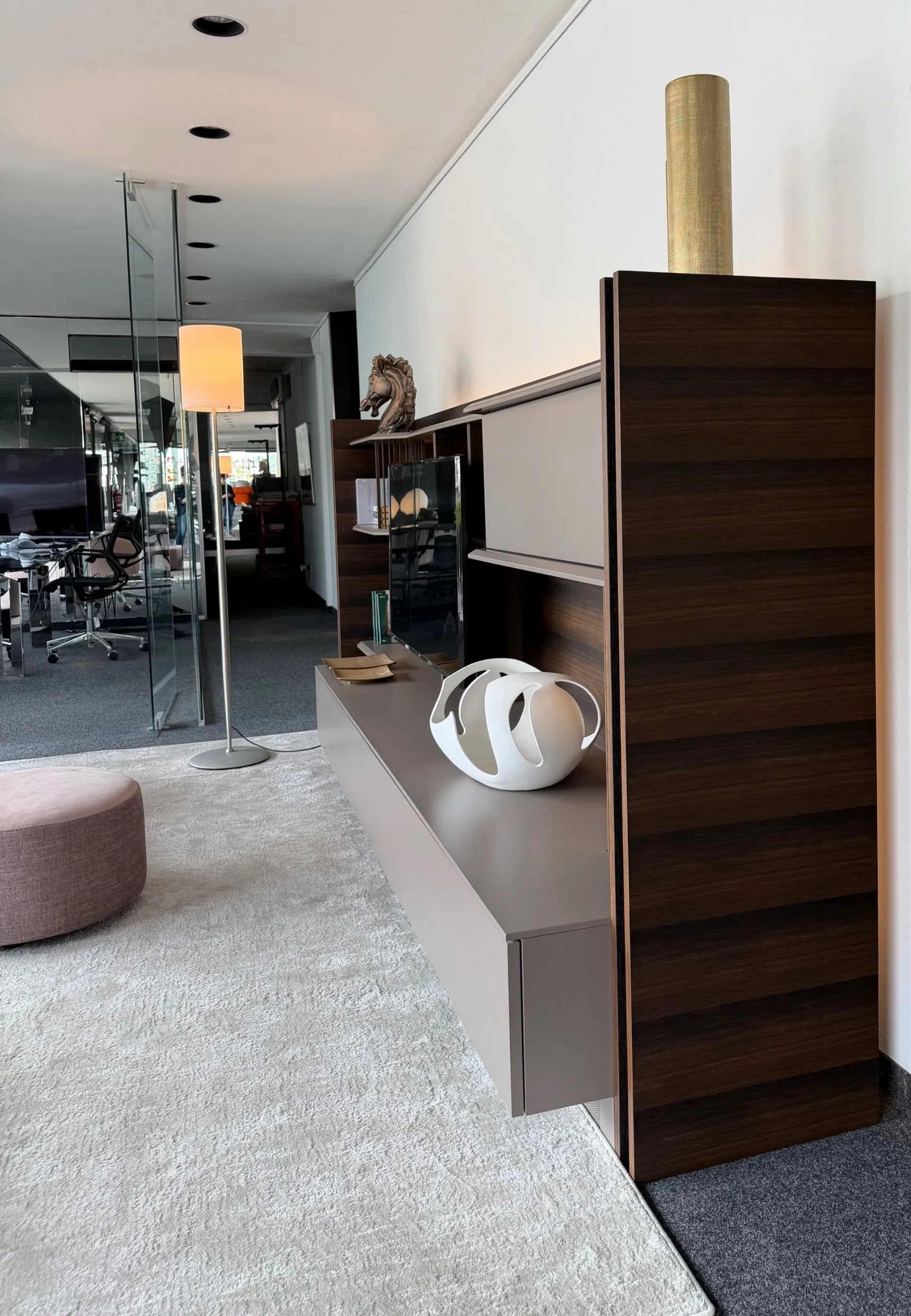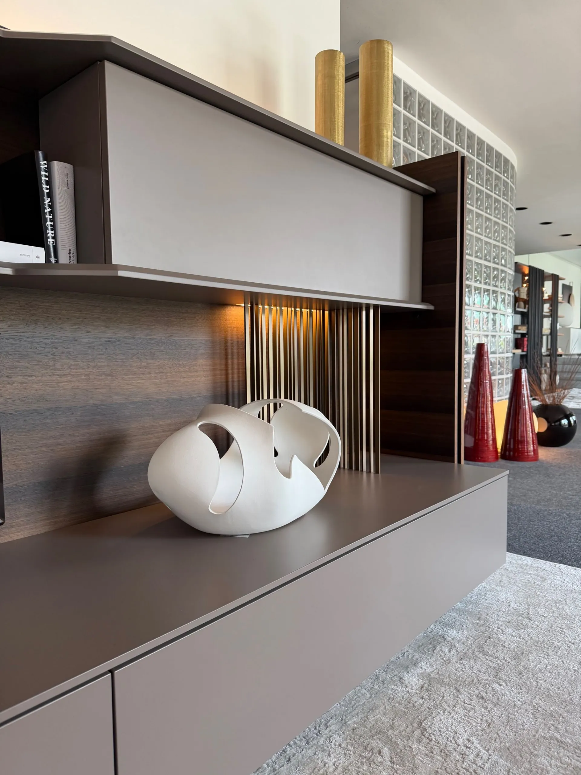Linee decise, materiali raffinati e dettagli tecnologici si incontrano in una struttura unica a “C” in rovere spessart, completamente rifinita anche sul retro. Questo significa una cosa sola: massima libertà di posizionamento. Puoi utilizzarla a parete oppure come elegante elemento divisorio centrostanza, creando ambienti dinamici e contemporanei. Elementi caratterizzanti: