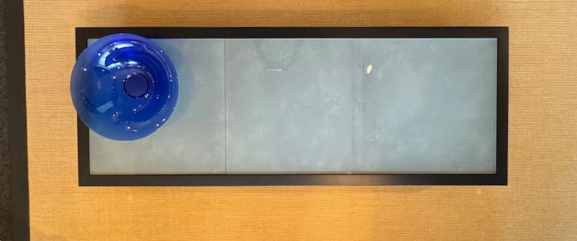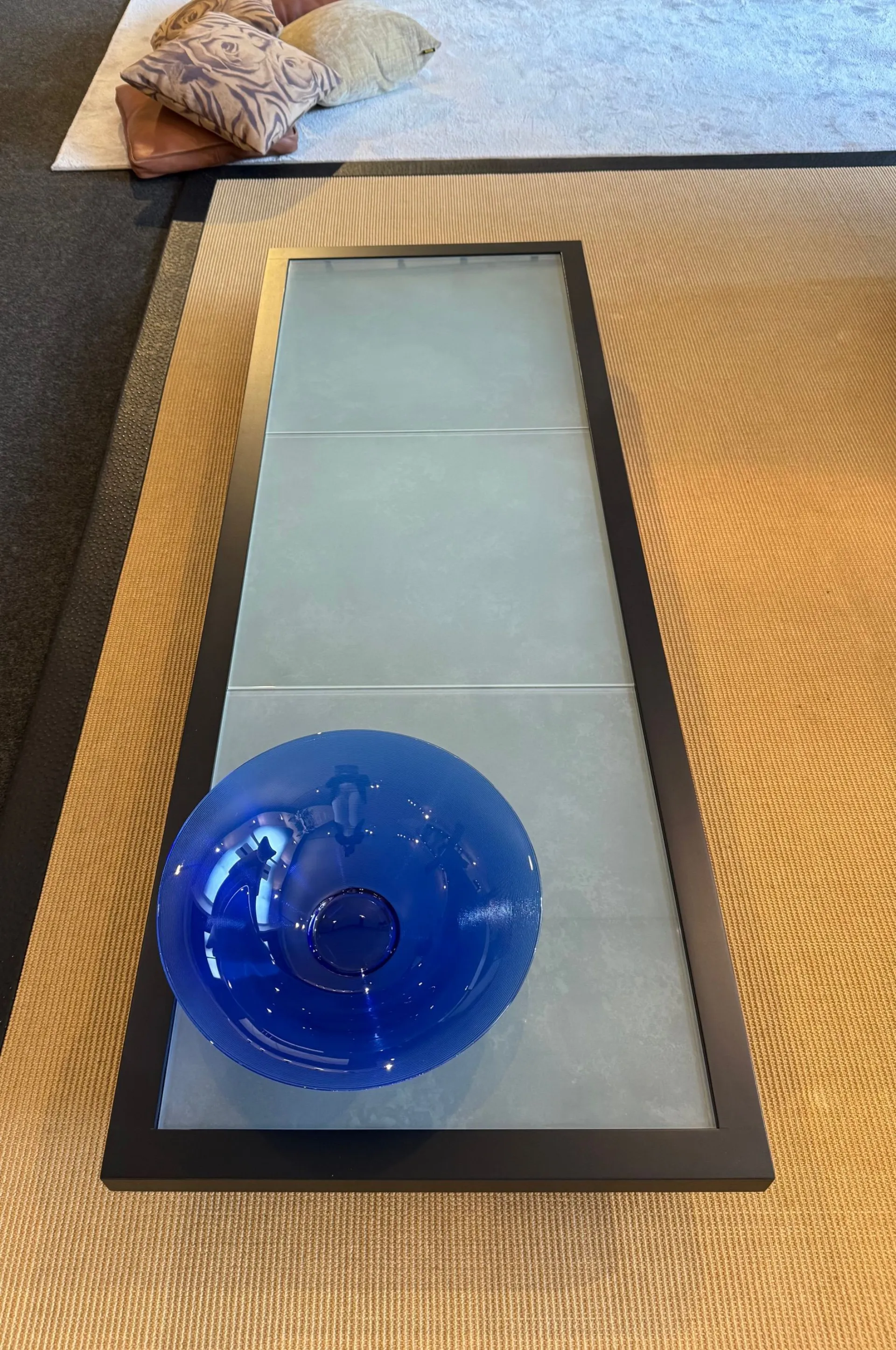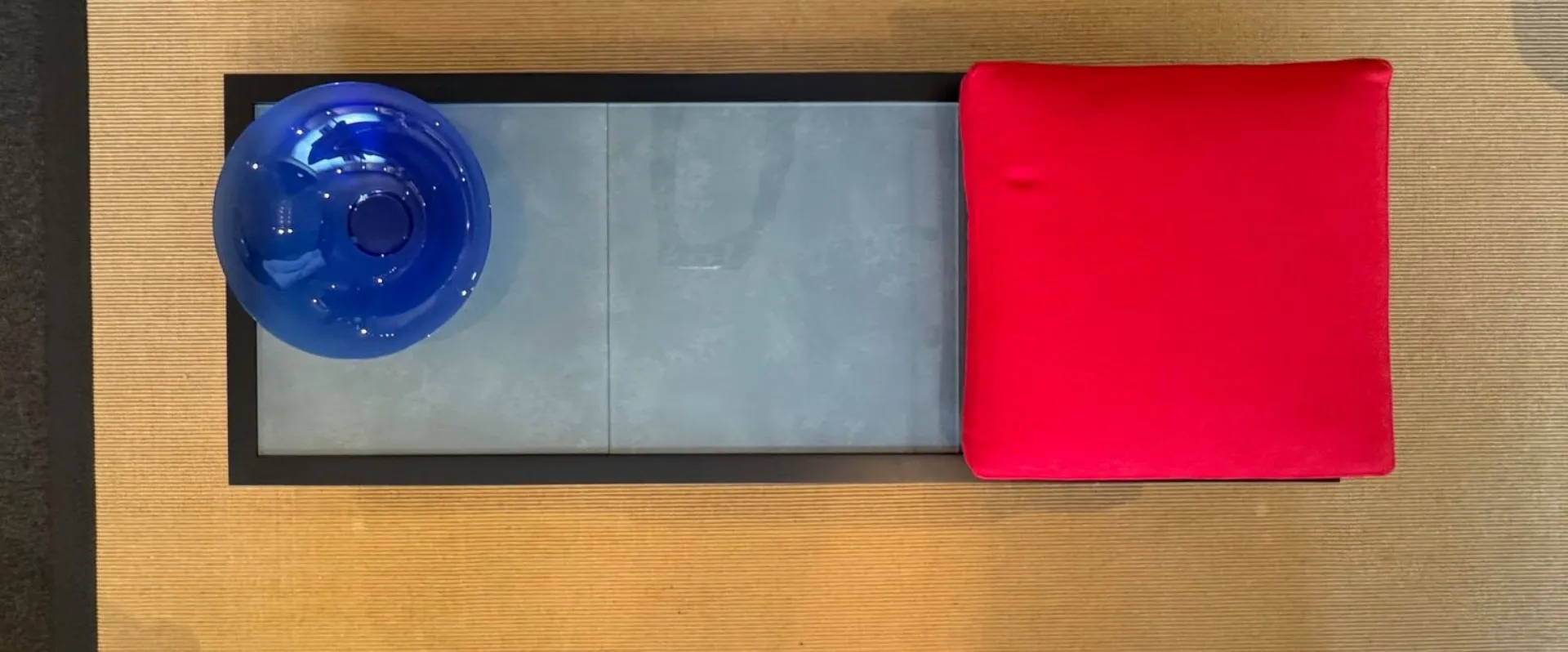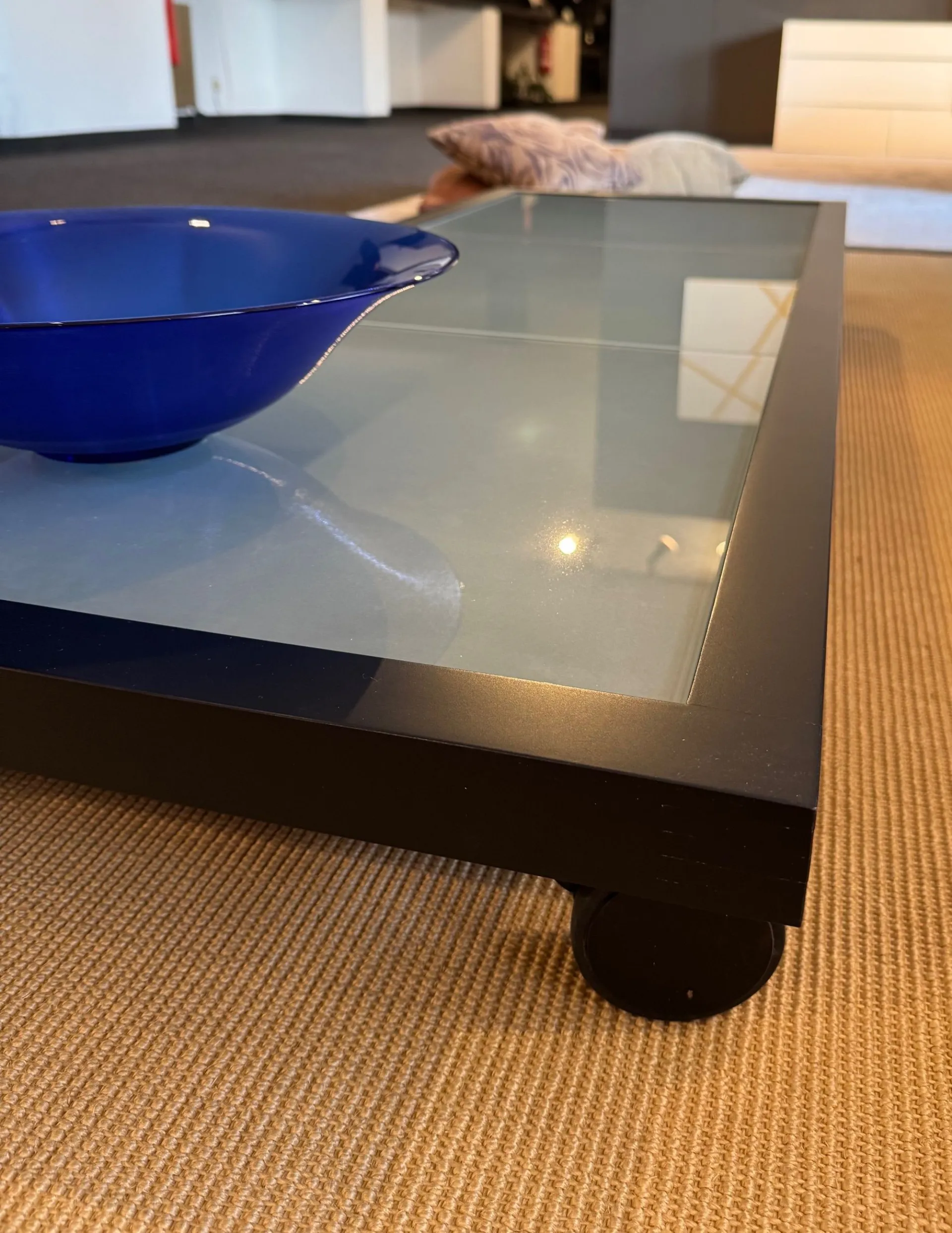 tavolino YATI di Cinova con piano in cristallo sabbiato, diviso in tre “settori”, con telaio in legno laccato nero opaco e ruote per facilitarne lo spostamento. Un cuscino/pouff in tessuto rosso Alabama 6 – cm 56x56x15h, sfoderabile è sovrapposto al piano.